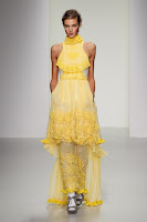 2 Years on since the duo won the Covent Garden Fashion Fringe, and the duo are striding into LFW. From past collections the pair have always been known for the dramatics. The collection was a mix of sports luxe and beautiful gowns, with rich yellows, nude, blues, multicolour feathers, extreme pleating (please can i have the pleated mini dress?!), peplums and of course some more sheer panelling!